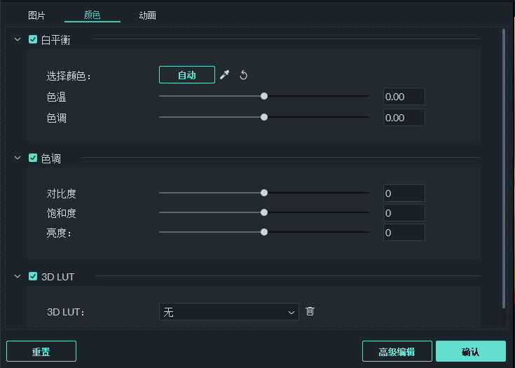 双击时间轴中的目标片段进入“编辑”面板,然后选择“颜色”菜单,窗口将显示如下: